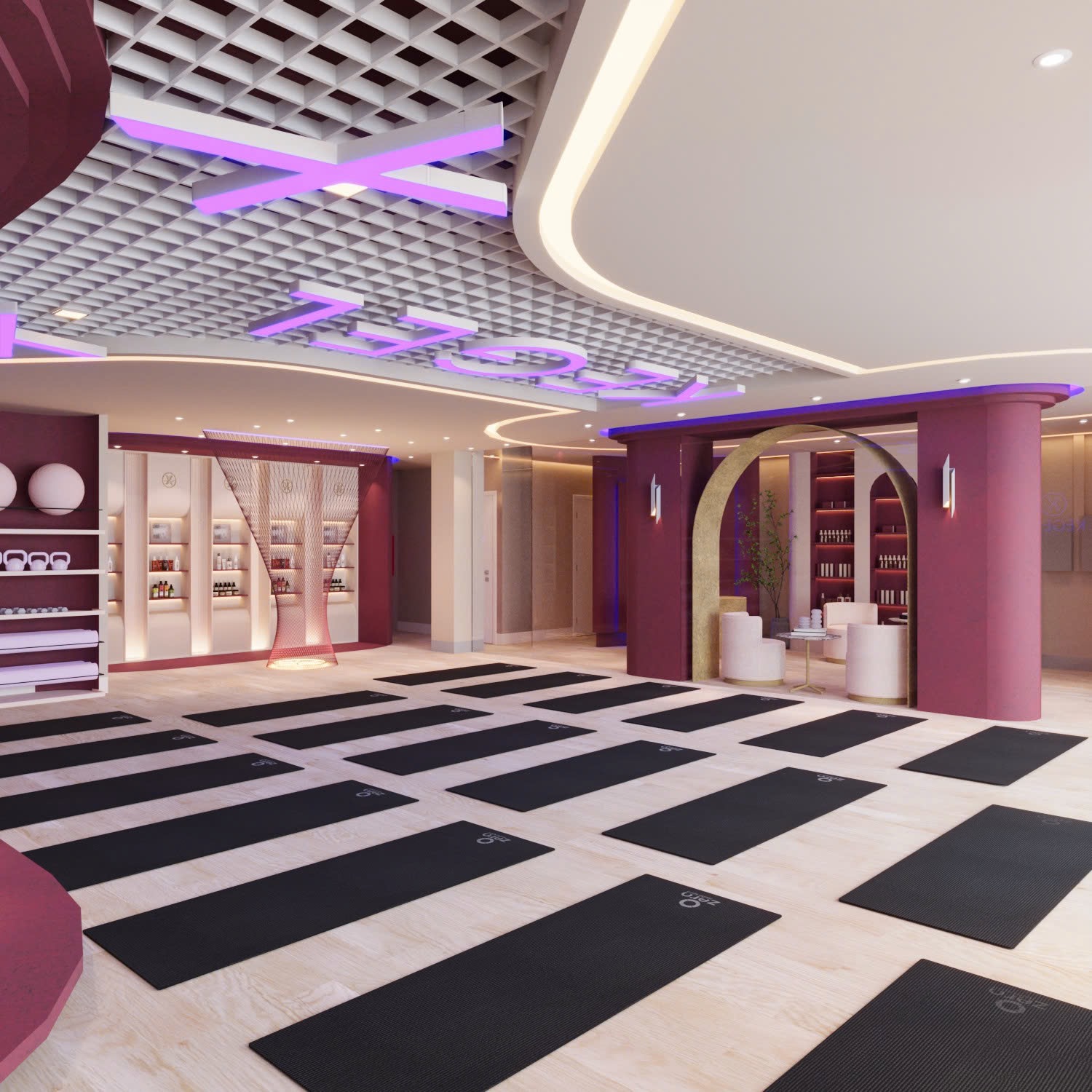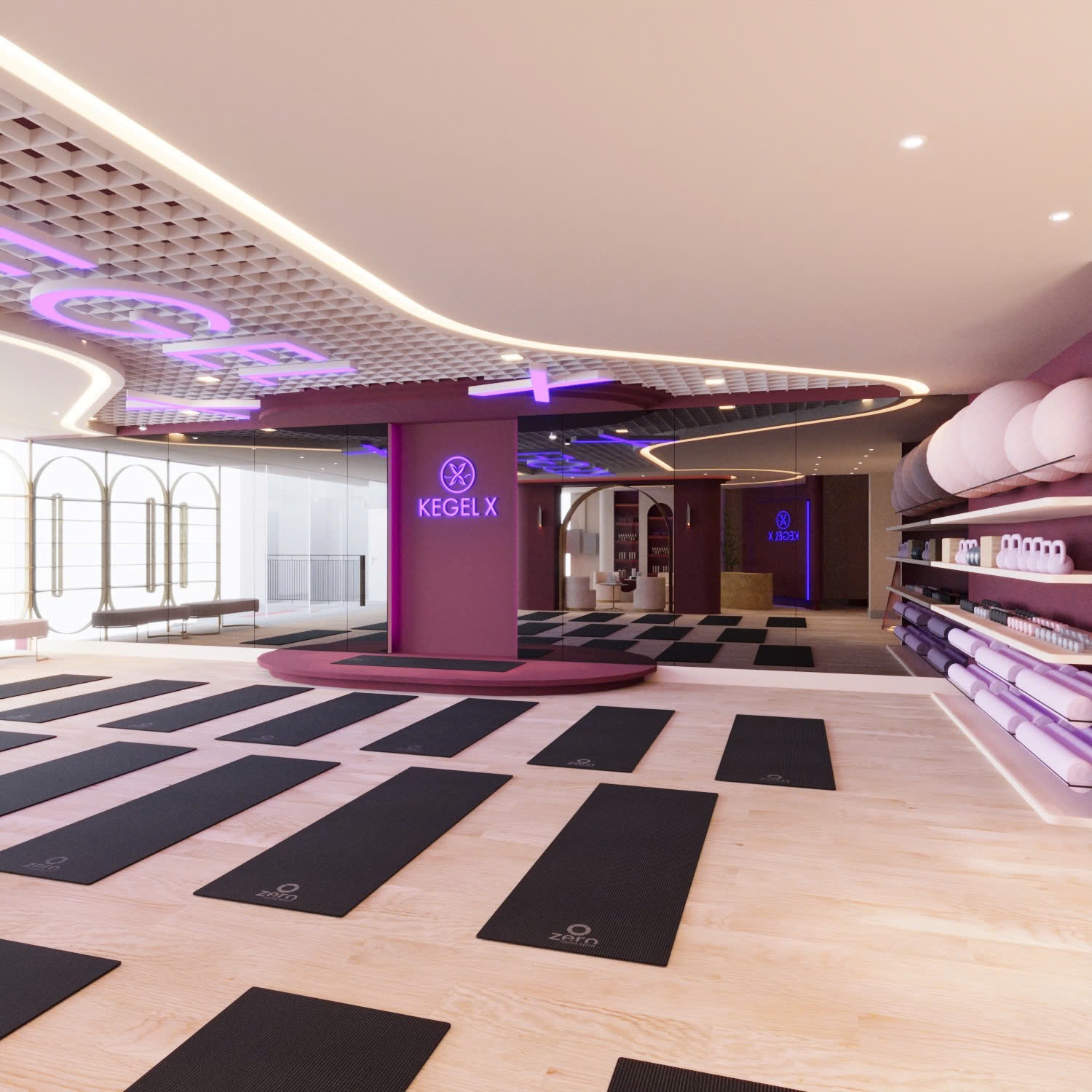 Ngay khi bước vào Kegel X, bạn sẽ cảm nhận được một không gian mở rộng rãi với thiết kế mang phong cách hiện đại. Tông màu tím – hồng chủ đạo tạo nên cảm giác nhẹ nhàng, nữ tính nhưng vẫn đầy năng lượng.